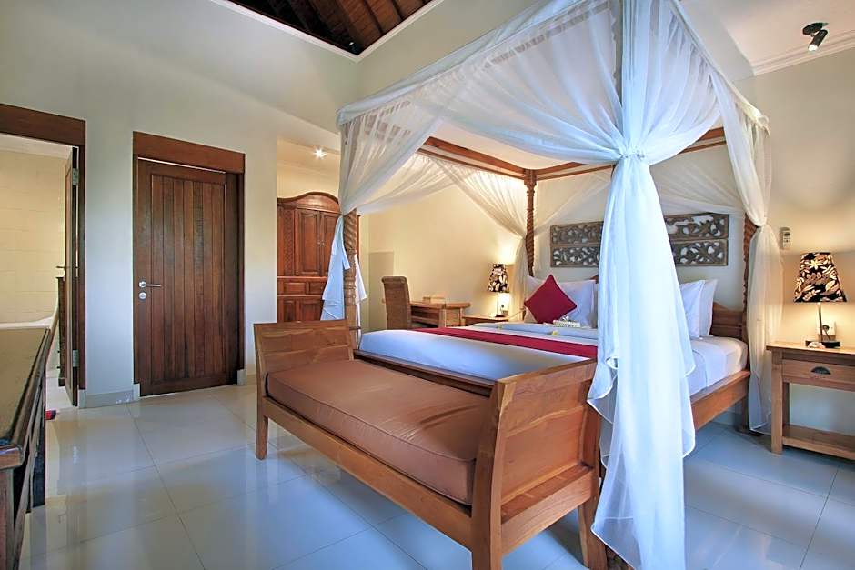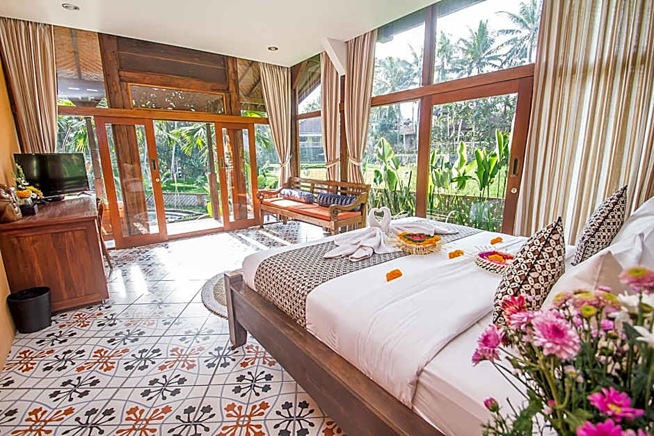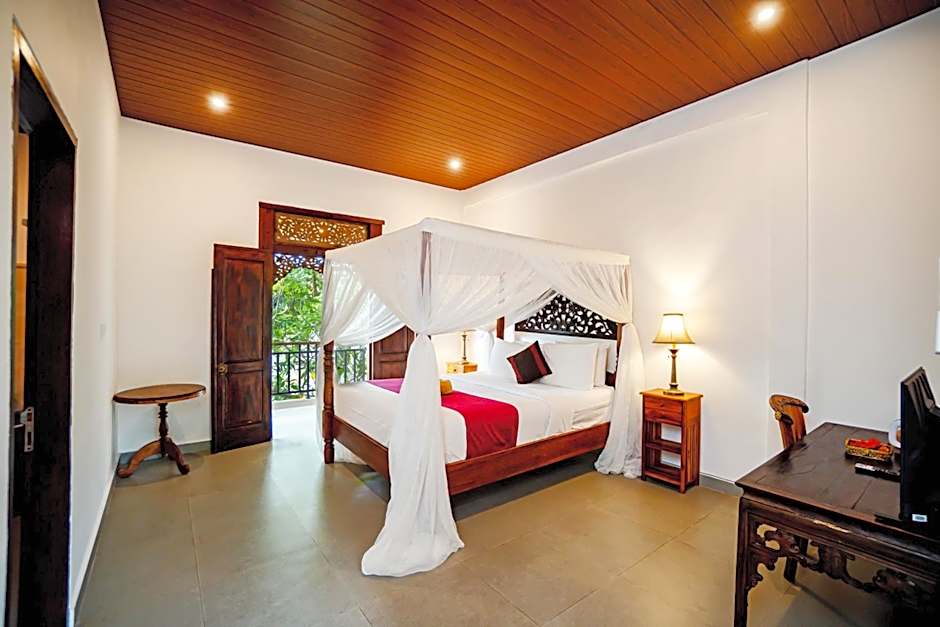 This double room has a balcony, bathrobe, and private entrance. Also, the pool is nearby, and the view is surrounded by a garden.